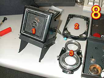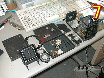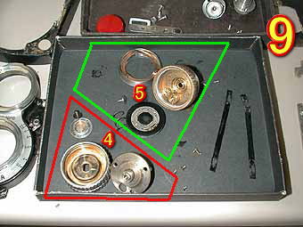 写真7は、今回分解の各部品です。今回はオーバーホールに近い修理をしていますので各部品が確認出来ると思います。 写真8は、各部品説明です。1はピントフード、2は、繰り出し部前面カバー、3はシャッター部ダルマ状カバーになります。ピントフードのすりガラスはかなりたいていは汚れていますので清掃すると非常に見やすくなります。ダルマ状のカバーはいろいろな形態があります。1部構造的に複雑なものがありますので注意して外してください。 |