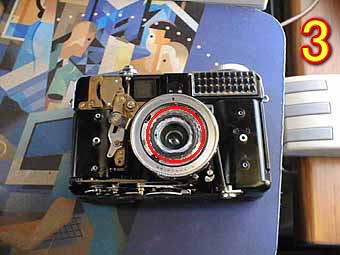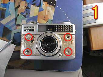 今回は、フジカの名機であるフジカハーフの分解です。若干いつもより細かくいきたいと思います。まず正面の皮バリを剥がします。そうすると写真1の状態になります。赤丸部分のネジ4つを外しますと正面のカバーが外れます。よくキャノンデミなどでいわれているモナカ状の構造をこのカメラもしています。次にシャッター内の分解です。まずレンズのネームプレートを外します。ここは、接着剤で付いているだけなので針のようなものを用いて静かに持ち上げます。外しますと写真2の状態になります。 写真2の赤丸部分のネジを外します。 |