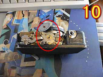 写真9は内部構造を後面からみたところです。赤丸部分はセルフタイマー機械部で小さなカメラの割には大きな面積を占めています。ここまで大きなパーツを組み込む必要があったほどにセルフタイマーの価値があったと思われます。緑矢印は豪勢にプリズムが使用されています。 写真10は裏面を分解したところです。このカメラのフィルムカウンターは底部にある為、非常に凝った構造になっています。赤丸部分がフィルムカウンター部です。小さなスペースにぎっちりと詰め込まれた各部品の配置は芸術的に私は思います。 |