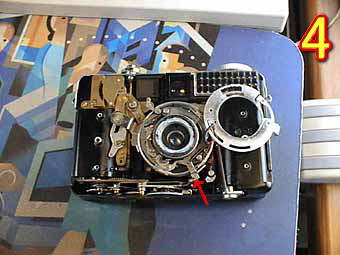 次に写真3の赤丸部分のシャッター調速プレートを止めているリングを外します。外しますと写真4の状態になり各シャッター内部品に注油が可能になります。最低でもここまでばらしてあげないとシャッター内の注油は出来ません。よくシャッターの隙間から注油する人もいますが部品の肝心な部分に注油されずに、おまけに注油か多くなってしまう為、かえってシャッターの調子が悪くなることが多いです。 写真4の赤矢印は、シャッターチャージレバーになります。 |
