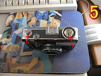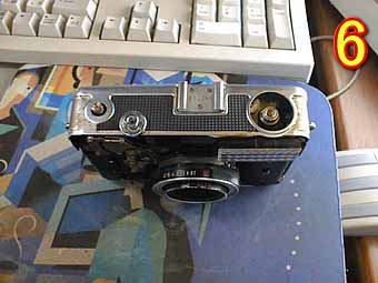 次にトップカバーを外していきます。キャノンデミよりセルフタイマーがある為少々やっかいです。まず巻き上げレバーと巻き戻しクランクを外します。そうすると写真5の状態になります。次にセルフタイマーの中にあるリングを外してカニ目でセルフ自体を回すと写真6のようにセルフ部品が外れます。 | ![]() |