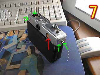 次に感度調節のレバー内の貼り皮を剥がすと2つのネジがありますのでそのネジを外すと写真7のように感度調節レバーが外れます。あとは左右の4つのネジを外しますとやっとトップカバーが外れます。この構造はフジカコンパクト35シリーズも基本的