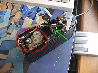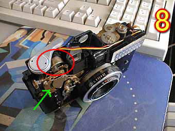 に同じです。 写真8は内部構造になります。緑矢印部分はメーターくわえ込み部になりメーター針が振れることによりシャッターを押すことによりくわえ込まれ絞り値が決定するという構造になっています。赤丸部分はメーターになります。 |