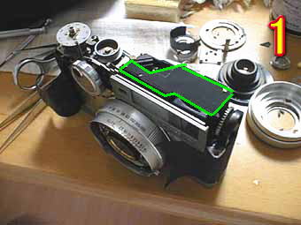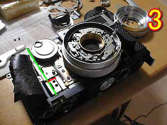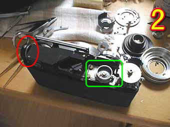 今回は、私のベスト1機種のフジカV2の分解です。非常に内部構造もシンプルであり壊れにくい機種であるが、今回は故障していた。写真1は、トップカバーを開けたところである。緑部分は、ファインダーを覆っている金属カバーである。年式が新しくなると黒い遮光紙になっていくが金属版のほうが保守はしやすいと思う。写真2の緑丸は、フジカお得意の背面ノブ式連動距離計部である。内部の構造はシンプルであるが精度の出やすい構造になっている。赤丸は、これもフジカお得意の側面巻き戻しノブでファインダー部の下にギアがもう1枚ありそこと連動して巻き上げをする。 | ![]() |