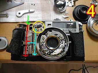 写真3は、今回の故障の原因であったシャッターボタン連動バーである。緑部分がシャッターボタン連動バーであるが赤色の部分にシャッター本体とつなぐバーが伸びているこの部分がうまくリンク出来ていなかったのでシャッターボタンが切れなかった。写真4は、くわえ込み式の連動露出計の構造である。緑方向にシャッターボタンが押されると赤色のバーが押され水色部分のくわえ込み用のバーに力が加わり黄色部分のメーター部メーター針をくわえ込む。それによって露出を決定する構造になっている。 | ![]() |