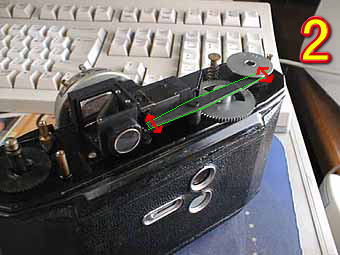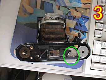 今回は、マミヤの名機である。マミヤ6の分解です。自動巻き止め装置のない6Kですが。蛇腹の補修に関しては、HAMAの遮光テープを使用しています。若干固いのですが。後、製本用テープなどもお勧めです。写真1はトップカバーを外したところです。部品数も少なく、非常に壊れづらいと思われます。写真2は、距離計の構造です。このカメラの特徴であるバックフォーカスを採用しているので距離計の精度、構造も非常に良いカメラです。緑で囲われたバーの前後運動で距離計を動かしています。距離表示プレートのしたにカムがあるので緑のバーが動くわけです。 | ![]() |