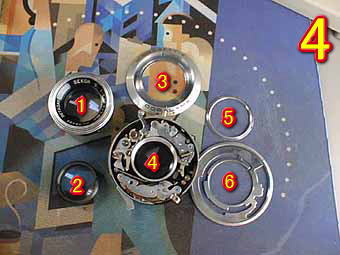 写真3は、上部から見たところです。緑丸の部分が距離調節部でこれが、内部のバックフォーカスプレートの4つの勾玉j状のカムに連動してフィルム面のピント位置を決めます。写真4は、シャッターを降ろして簡単に分解したところです。1は前群レンズ、2は後群レンズ、3は速度リング押さえプレート、4はシャッター本体、5は3のプレートを押さえるリング、6はシャッター速度を決めるリングになります。レンズ、シャッター内部の清掃、注油を行って今回のレストアは完了しました。 | ![]() |