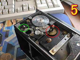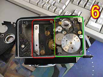 写真3は、シャッターリングをつけたところです。円盤の切り抜きでスローガバナーの速度調整をしています。 写真4は、ファインダー部を外したところです。ミラーがカビなどで劣化している場合が多いのでオリジナルを追求しないのであれば、新しいミラーにかえることも可能です。(市販の手鏡などを切って)ファインダー部は、国産機であれば4本のネジで止めてある方法が多いので簡単に外してスクリーン、ミラーの清掃が出来ると思います。 |