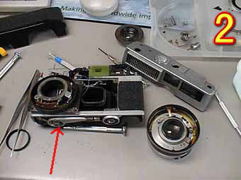 今回は、ペトリらしい個性の強いカメラであるプレストの分解です。実際の作業は非常に手間がかかっていたのですが写真の撮り忘れで写真数が少なくなってしまいました。写真1は、各ブロックごとに分解したところです。ペトリらしく各部品の作りは大柄に思えます。緑丸は巻き上げレバーからシャッターチャージへのリンクを行うリングです。前のペトリ35の時同様に鏡胴を押さえつけているリングがだんだん使っていくうちに動いてきてしまいシャッターチャージができなくなってしまうことが多いです。ペトリの故障品を見たらまずそこを疑ったほうが良いと思います。赤矢印は普通ならば巻き上げレバーからのリンクがあるのですがこのカメラは写真2の赤矢印のように底部巻き上げの為、距離計調節の為のレバーのみ付いています。写真には無いのですが底部巻き上げの部品は1時代前カメラのように大柄で精度も低く非常に壊れやすいと思います。写真3はシャッター部を反対から見たところです。赤矢印部分がシャッターチャージの為のリングです。私が分解してみて思うには、各部品の精度、構造的に見てもかなりのリコールがあったように思えます。カメラと見ればあまり良いカメラではありませんがスタイル、ペトリのチャレンジングスピリットの感じるカメラで私は非常に好きなカメラの1台です。 | ![]() |