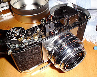 | 今年からは少し趣きを変えて患者のコーナーを作っていきたいと思います。機能的に面白いものを中心に紹介していきますのでよろしくお願いします。今回はリコーJETと同じなのにリコー500のネームを持つ変種の分解です。いけね!!肝心なトップカバーの写真を撮り忘れていました!!カメラの紹介のアップまで少々お待ちを!! |
