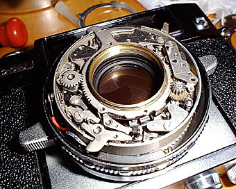 | 従来ブライトフレームなしのリコーのレンズシャッター機のこのカメラ同様にファインダーの下に巻き上げ機能をもっています。リコーのこの時代の巻上げの特徴は巻き上げ完了寸前に巻き上げが重くなり大きな音がします。これの解決法はファインダー下のギア類のグリス切れによって起こります。なのでここのグリスアップをすることにより軽快なトリガー巻上げができるようになります。基本的箱型リコーは故障する部分が少ないので非常に完成度の高いカメラであると思います。 | シャッター内部の様子です。トリガーは下部にあるのにチャージレバーは上部にあります。よく考えると下部にあるトリガーにチャージレバーも下部にあった方が効率が良いように思えます。なぜなんでしょう?リコレットの時代から名残がここまでひきずっているのでしょうか?ちなみにリコーJETがトリガー付のカパッと外れる方式のものが最後になります。リコレットからの伝統がここで消えます。ちなみに底蓋はすべてのカメラに流用が可能です。 |