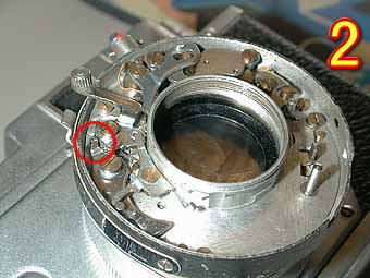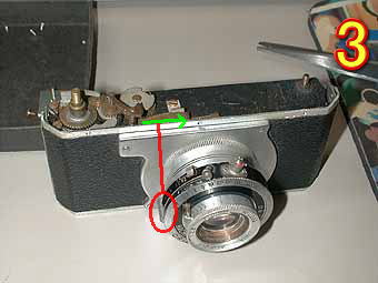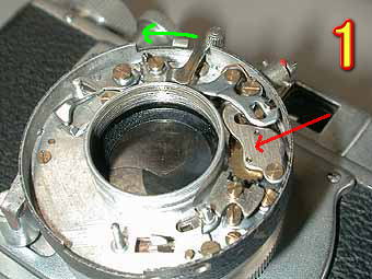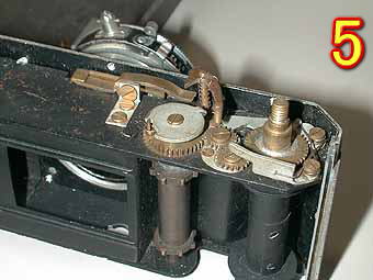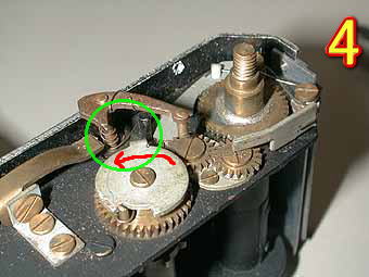 今回は、「謎のカメラ」紹介したロレックス35の分解です。際立って特殊な機能も無いが非常にシンプルなカメラです。ただこの時代には珍しい自動巻き止め機能をもっています。詳しいカメラ自体のことに関しては「謎のカメラ」のほうを見てください。 写真1は、シャッター内部の構造をみたところです。このシャッターはオリエントUシャッターです。緑矢印の方向にシャッターチャージをしますが今回のトラブルであったシャッターチャージが出来ないということでした。ちなみに赤矢印部分は、スローガバナー部です。 写真2の赤丸は今回の故障の原因となったチャージを引っかける突起です。この部品が曲がっていた為、チャージが出来なくなっていました。今回は写真には無いのですがシャッター羽のさび、油を除去する為、シャッターをもう1段分解して一枚一枚各羽をベンジンで清掃しました。 写真3は、トップカバーを外したところです。非常になんにも無いです。少々見づらいのですが赤丸部分に大きなレバーがありシャッターのレリーズをしています。シャッターボタンを押すと緑方向にレバーが動き内部を通って赤丸のレバーを動かす構造になっています。 写真4は、自動巻き止め機構の拡大写真です。巻き上げをすると赤矢印方向に回転すると緑丸の部分の突起に引っかかって自動巻き止めをする構造になっています。 写真5は、巻き止め機構を裏から見たところです。 写真6は、トップカバーです。ファインダー以外何もなく非常にシンプルです。 このカメラの情報をお持ちの方がいらっしゃれば連絡をお待ちしております。 |