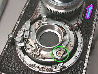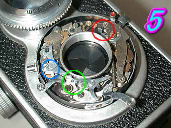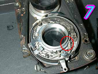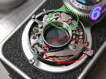 RICOHFLEX MODELZS セルフタイマー内蔵シャッターになります。セルフタイマー内蔵モデルで多いトラブルは赤丸部分のセルフタイマーの時間調節用の板状の部品の変形があります。セルフタイマーユニットのチャージ部分に切り抜きがあってその部分に入るとシャッターが切れる構造になっています。この部品が変形している為にシャッターが切れなくなっているものが多くあります。部品自体は固いので折れることは無いと思うのですが調整が微妙なので注意して修正する必要があります。青丸、緑丸部分はCOSMOFLEXの欄で述べた部分の同じです。 写真6の緑丸部分がスローガバナー部で赤丸部分がセルフタイマーユニットです。ぽつぽつと穴のあいている部分がギアの軸なのでここに注油するとギアがうまく動くようになります。 |