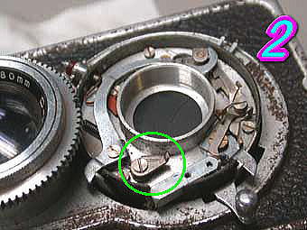 CRYSTAR25 ガバナーを使わずにスプリングでシャッター速を変えているタイプのシャッターです。構造は非常に簡単ですが実際の速度の誤差は非常に大きいです。リコーフレックスのモデルZまでのリケンシャッターなどはこの構造になっています。 写真1の緑丸の部分でシャッターの開閉を行っています。 写真2の緑丸部分でシャッター速度の変更を行います。 このタイプのシャッターで多いトラブルは、羽根の張り付きといろいろなところに使われているスプリングの外れが多いと思います。各部品の動きを観察すれば簡単に故障の原因はわかると思います。 |
