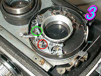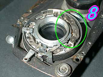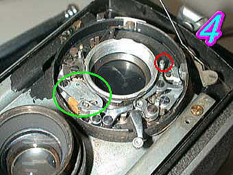 COSMOFLEX セルフタイマーを持たないタイプのシャッターです。セルフタイマーを組み込めるスペースががらんと開いています。 チャージをすると一緒にシャッターが開いてしまうトラブルの場合は写真3の緑丸部分の下にあるシャッター羽根のかみ合わせ部分の部品の変形、劣化が考えられます。カギ状のものがシャッターチャージ時には引っかからずにシャッターを切ると引っ掛かります。チャージ時にこの部分の部品が引っかかってしまう為、チャージ時にシャッターが開いてしまいます。次にシャッターがチャージされずにシャッターが切れてしまうようなトラブルは写真3の赤丸部分のつめの変形、折れが考えられます。この部品の強度は非常に弱いので注意して修正する必要があります。折れてしまうとまず修理不能になります。特にNKSのシャッター、レクタス系のシャッターはこの部分の部品強度が低いのでかなり慎重に作業する必要があります。 写真4の緑丸部分が低速用のガバナーになります。 |