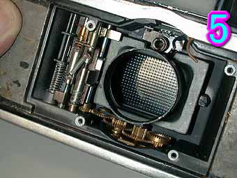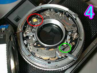 今回は、ひさしぶりに普通のレンジファインダー機でいきたいと思います。ヤシカの昔の高級機35EEに分解です。ヤシカ初のEEカメラです。 写真1は、トップカバーを開けたところです。メーターブロックが高い為、全体に大きくなってしまったことが内部構造から読み取れます。 写真2はメーターブロックの拡大写真です。非常に大きいメーターです。構造的には非常にシンプルな構造になっていますが部品の作りは非常にしっかりしています。ファインダー上部に別窓を設けてメーター針が見えるような構造になっているのが特徴です。その像は虚像を作らずに直接メーター針を見せる構造になっていることがわかります。 写真3は、ファインダーブロックを後方から見たところです。各部品は大柄ですが非常にきれいに作られています。 写真4は、コパルシャッターの内部です。ここでコパルシャッターが壊れやすい部分を紹介したいと思います。まず赤丸で囲んであるチャージキーです。この部分が回転してシャッターをチャージします。裏面が十字状になっていて本体と接合するのですがこの部分の十字の部分の部品が折れてしまうことが多いです。こうなると非常に修理が難しいと思います。次に緑丸で囲われた部分がセルフタイマーのタイミングを取る部品です。普段は切り抜きの部分にシャッター羽根にリンクする板状なものが動くのですがセルフタイマーをかけるとその板状のものが押さえられタイミングをとる構造になっています。この部分が変形してシャッターが切れなくなっていることが多々あります。まずコパルシャッターはここを見ることが大切です。よくジャンク品を見るとすぐにセルフタイマーを動かす人がいますが決して行ってはいけない行為です。この構造を見れば一目瞭然です。かえって故障を悪化させてしまいます。まずセルフタイマー部に注油した後にギア解除キーを押しながら少しずつセルフタイマーを戻してあげる必要があります。先ほどの板状の部品が変形していましたらまっすぐにする必要もあります。 写真5は、鏡胴ブロックを外したところです。ここいらにも高級機の香りがします。非常にギア、スプリングが多様されています。 写真6は上部から見たところです。いかにメーターブロックが大きく場所ととっているかが一目瞭然であると思います。 このころのヤシカのカメラはカメラはいかに高い買い物であったかがはっきりわかるカメラです。非常に全ての部品、構造がしっかりしていて壊れづらく直しやすいと思います。今のカメラメーカーにも見習って頂きたいものです。(カメラは消耗品ではないことを) |