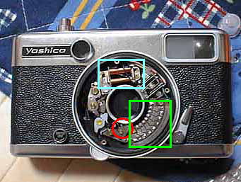 全開にならなかった原因は、赤丸の部分の油切れでした。シャ ッター羽根をこの部分のピンを用いて動かすのであるが、このピ ンが途中でとまってしまいシャッターが全開にならなかった。 ちなみに青でかこった部分がシャッター速を決める電磁コイル、 緑で囲った部分が、絞り情報を伝える基盤である。 今回は、これで修理が完了したのでトップカバーは、あけません でした。 |
