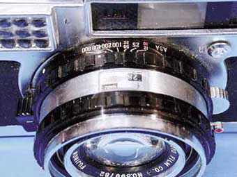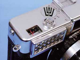 受光部上部のレイアウトを見る。 視認性の高いメーター、被写界深度確認が距離計ノブに 彫り込まれている。 |