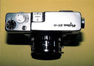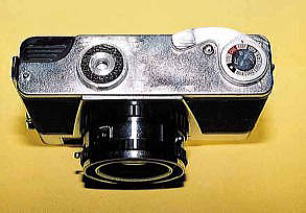| 上面からみる。 撮影駒数指示ダイヤルと焦点調節ギアが見える。 巻き上げレバーがないためすっきりとしている。 |