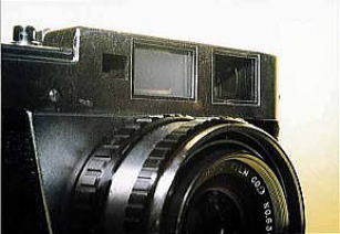 ファイインダー部から見る。 ゴールデンフレームと言う名で発売された ブライトフレームファインダーである。 |