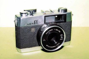 レンズ:フジノン38mm F2.8(3群4枚) シャッター:セイコー電子プログラム(4〜1/800) シンクロ:X接点、ホットシュー付き ファインダー:採光式ブライトフレーム 焦点調節:全群ヘリコイド、目測、ゾーンフォーカス 露光調節: CdS使用電子シャッタープログラムEE フィルム送り:レバー巻き上げ、クランク巻き戻し フィルター:46mmねじ込み 寸法:112×69、5×53mm 重量:330g 発売:1973(昭和48)年6月発売 価格:23000円 |