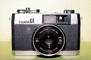 | 前作GPより格段とスペックアップして発売されたのが、フジカGEである。この時代になると電子シャッターの安定性もあがり、各カメラメーカーも電子シャッター付きのカメラを発売することになっていた。1番の特徴は、世界初のフィルムの有無、種類がわかる裏窓がついたことである。この機能は、いまの時代になってもうけつながれている。 あいかわらず初心者をターゲットとしているフジカらしく各種の安全シグナルで撮影ミスを一掃出来、電子シャッターEEプログラムシャッターのおかげで露出を気にかけないカメラにしあがっている。 |