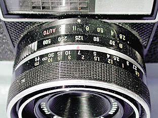 レンズ回りを見る。 うわさのコパルマジックシャッターである。 オート撮影以外にマニュアルでも撮影が出来る。 |