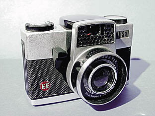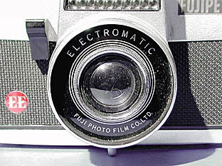 | 大ヒットであったフジペットに露出計ののせてEE撮影が出来るようにしたのがこのフジペットEEである。EEの構造は非常にシンプルでメーター部に勾玉型絞りが直接付けてあり その振れかたにより絞りを調節するというものであった。分解してみると部品数も少なく、非常に良く出来たカメラであると思う。中古市場では、結構高値で販売されている。メーターが壊れていると1/60 F11でしか使えないので購入の際はメーターは確認する必要がある。 |
