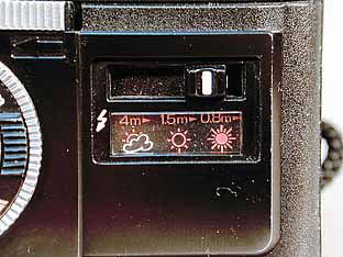 絞り調節部を見る。 上のm表示は、ストロボ用である。 |