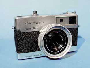 | ミノルタ唯一のラピッドカメラである。各メーカー少量のラピッドカメラを発売していたが、人気の低さにすぐに撤退してしまった。このカメラの126サイズ版も名前を変えて発売されていた。なぜかCdsが斜めについている。始めは、曲がっているのかと思い分解してみたのだが、構造的に斜めにつくようになっていた。後に雑誌広告をみたら確かに斜めについていた。中古市場では、人気の無さかほとんど見ることがない。実用性も低くコレクター向けのカメラである。 | ||