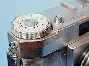 巻き上げ部を見る。 巻き上げはノブ式でその横にシャツターボタンがある。 |