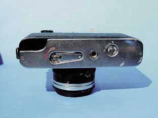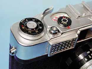 巻き上げ部から見る。 手動式Fフィルムカウンターと露出メーターがわかる。 |