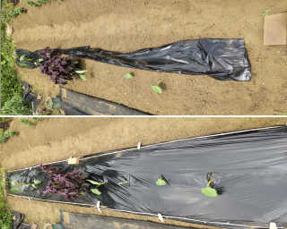 植える時期は遅い、芋は小さいで芽が出来るか、育つのかで植えた後、畝に黒マルチを掛け