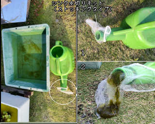 が、メダカの水槽の水をシンク水切りネット(ストッキングタイプ)で藻等を濾せば