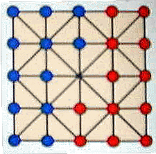 2人用のアブストラクト(抽象)ゲーム。 交互に駒を動かし、自分の番には駒を一つ、線に沿って次の交点に動かす。 隣に相手の駒がいて、その先が空いていれば、相手の駒を飛び越して先に進み、飛び越した駒を取ることができる。