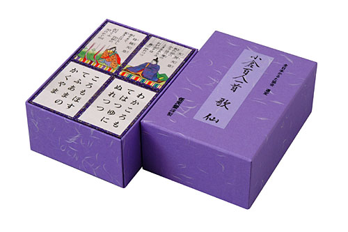 藤原定家が編纂した小倉百人一首を一首ごとに読み札と取り札を作ったもの。本来百人一首とは百人の人間の歌を一人一首ずつ集めた歌集のことであるが、この小倉百人一首があまりに有名であるため、通常百人一首といえば、小倉百人一首を指す。