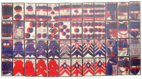 4スーツの遊戯札。数字札が1から9までと、3種類の絵札から成る。計48枚。 貨幣の2が、3つの扇を合わせて円にしたようなデザインになっている。 北陸地方で遊ばれていたと考えられている。 三ツ扇(清花堂) 三ツ扇・裁断前(大石天狗堂)