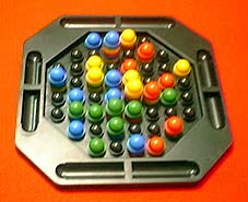 2人または4人用のアブストラクト(抽象)ゲーム。 半球型の駒をボードに配置。 自分の駒を動かして別な駒の上に載せることができ、その高さの分だけ移動できる。