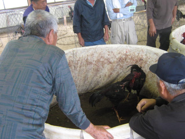 実態を知らない人間は、動物同士の闘いを残酷と感じ、虐待しているというイメージを抱いているかもしれませんが、闘鶏の愛好家は皆自分の軍鶏を可愛がっています。終われば水で洗い、けがをした部分に薬を塗ります。闘えるのは一定の年齢の間だけなので、過ぎれば食用になるのはやむを得ないのでしょうけど。