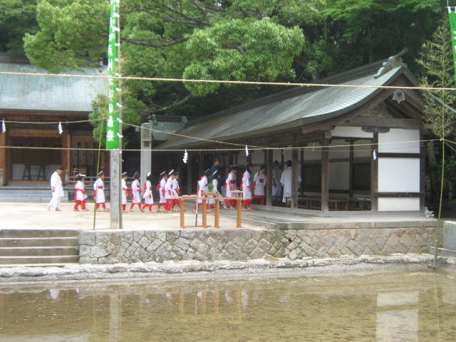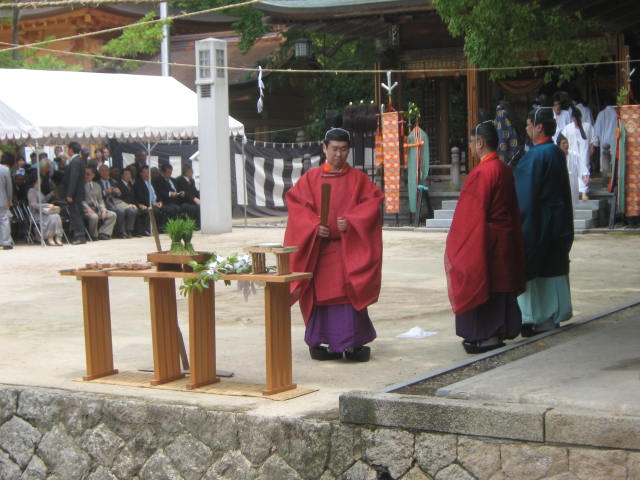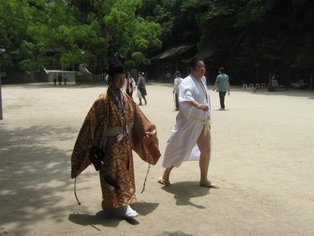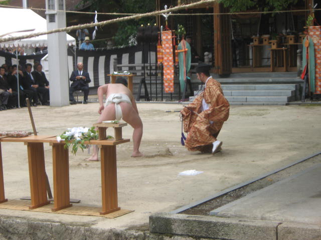 愛媛県今治市、ではありますが瀬戸内海に浮かぶ大三島。そこにある大山祇(おおやまずみ)神社の春秋の祭礼で行われるのが一人角力(ひとりすもう)です。慣用句では一人で勝手な事をする意味ですが、ここでは人間が精霊と相撲を取る事を言います。精霊は人間の目に見えないので、一人で相撲を取っているように見えるわけです。というか、見えるように相撲を取らなければなりません。久しく耐えていた行事ですが、数年前にこの力士を務める人が見つかり、今では多くの観光客が訪れます。祭礼は様々な行事から成っており、春は田植え、秋は稲刈りが中心です。一人角力は境内に作られた土俵で行われます。力士である一力山と行事が出てきて、まず神に拝礼。続いて3番勝負となります。一力山は組み合ったり押しあったり、押されて土俵際でこらえたり、足を取られてよろめいたり、たいへんな演技力です。土俵の外に勢いよく突き飛ばされてまず一敗。再び仕切って取り組み、今度は勝ちます。3番目は土俵の上で見事にひっくり返され、精霊の二勝一敗で目出度く方策が約束されると言うわけです。 。