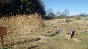 写真:水辺の葦原(歴史公園)葦の多くが刈られ幼稚園の園庭ほどの広さの葦原が残っている。ここにエナガやメジロなどの小鳥が入って餌を捕っている。