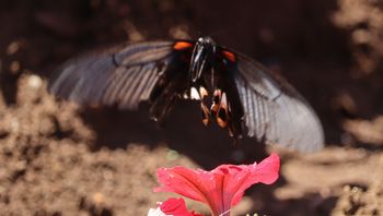 不動の滝に向かうと旧家の庭先にモンキアゲハが舞った。