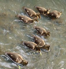 子ガモは8羽、親ガモの周囲をまとわるように取り囲んでいた。