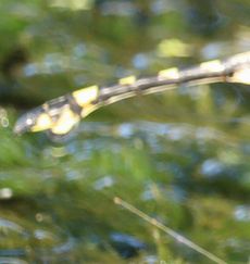 写真:ウチワヤンマ産卵(水元)腹蘭から粘液の糸に包まれた卵が連なって見える。