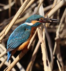 カメラを向けた水路の葦原にカワセミが止まっていた。