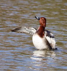 写真:ホシハジロの群れ(水元)この中に1羽、少し小さい赤っぽいカモがいた。