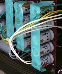 | 内部の状態だが、一見して気になるのが少し大き目のコンデンサが並ぶエリアで、(後に入手した回路図によると高圧整流回路のようだが)何やらテープが貼られている。テープの下のコンデンサには茶色の付着物がある。よく見ると液漏れではなく古いテープの糊が劣化したような感じで少し安心。 ただ、なぜテープが貼られているのか意図が不明だ。強いて挙げるならば、コンデンサが破裂した場合の飛散防止か。 |