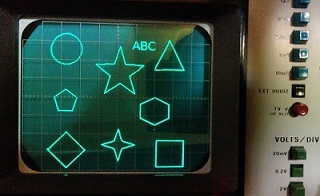 | オシロスコープ・グラフィックスHW/SW開発 | ■イメージデータの表示実験 Windowsのペイントで適当に図形を描き、BMPフォーマットで保存。 それを、自作ジェネレータ から出力して本機のX-Y入力へ。 |