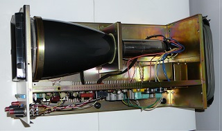 | 内部の構造はシンプル。CRTと回路基板x1枚がきれいに左右に分かれており、ビンテージオシロに見られるような、垂直軸回路基板,水平軸回路基板・・・のように機能回路毎に基板が分割されてケース内のあちこち立体的に配置され、その間を配線が蜘蛛の糸のように繋がっている、というような雑然とした設計にはなってない。 欲を言えば、配線が半田付けではなくソケット化されているとメンテがずっと楽になりそうだが。 |