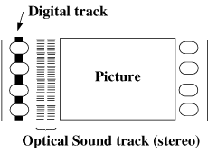 ドルビーステレオ・デジタルは1991年に発表された35mmフィルム用ディジタル音響フォーマットです。デジタルトラックと共に、従来の光学サウンドトラックにドルビーSRアナログデータを記録してあります。これにより1つのプリントでディジタル再生の映画館でも従来方式の映画館でも上映可能となります。また、デジタルデータに致命的なエラーが発生したときには自動的にアナログトラックに再生が切り替わりますので、安定して音響再生をおこなうことができます。